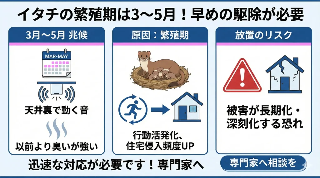 3月~5月にかけて「天井裏でイタチが動く音がする」「以前より臭いが強くなった」と感じるケースが増えてきます。原因と考えられるのが、繁殖期です。