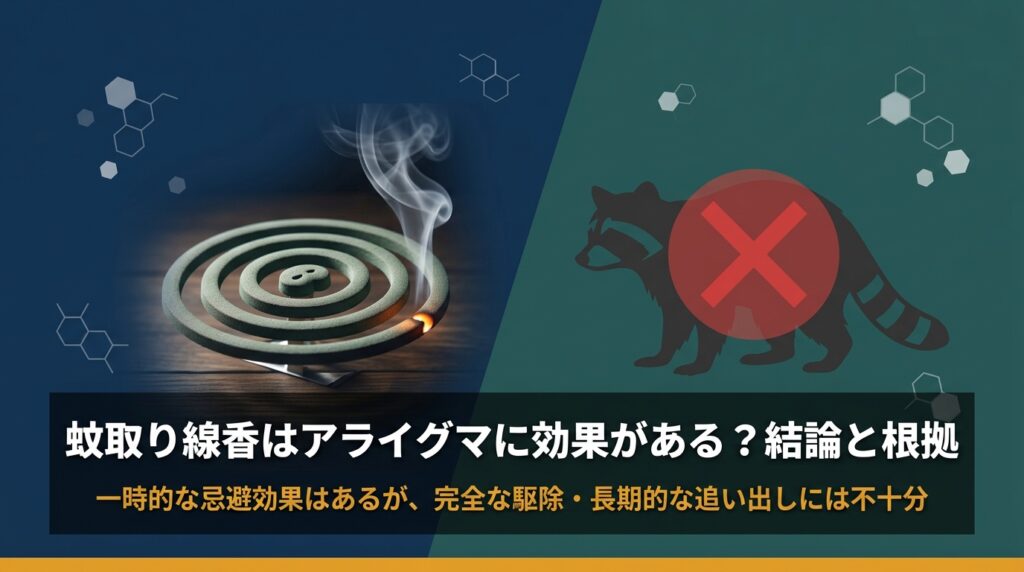 蚊取り線香はアライグマに対して一時的な忌避効果はあるものの、有効成分のピレスロイドは哺乳類への殺傷効果がなく、煙に慣れてしまうアライグマの学習能力を考慮すると、蚊取り線香だけで問題を解決することは現実的ではありません。使用する場合も火災リスクや健康被害への配慮が不可欠です。