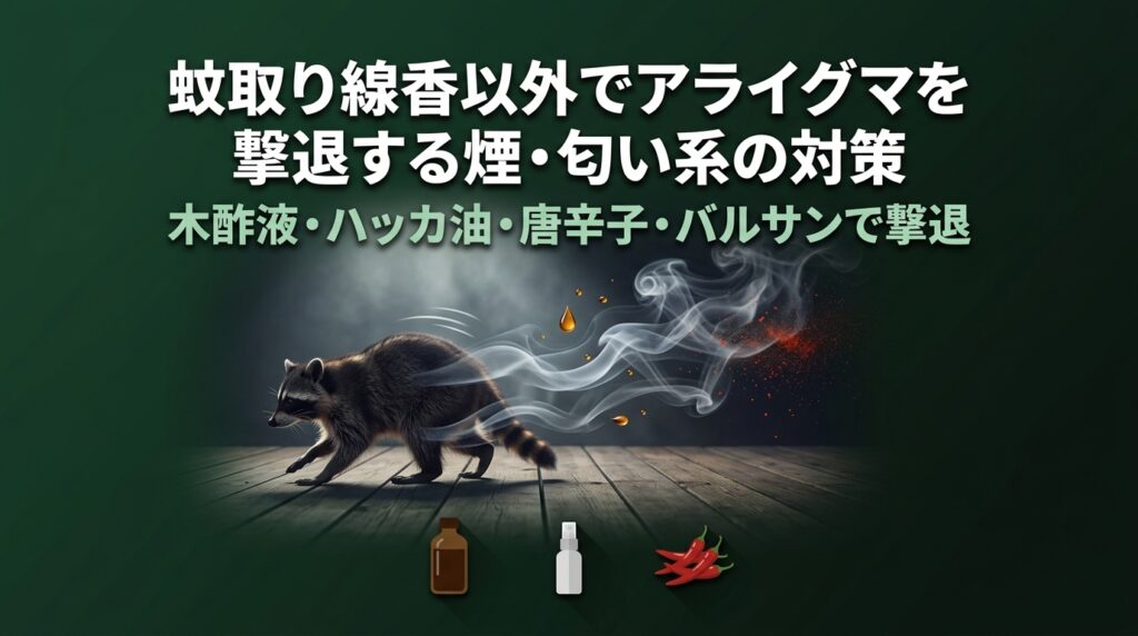 アライグマを撃退する煙としては、蚊取り線香のほかにバルサン(くん煙剤)、獣よけ線香、木酢液の燻煙などがあります。嫌がる匂いとしては木酢液・ハッカ油・唐辛子成分が代表的です。蚊取り線香よりも強力な手段を知りたい方に向けて、それぞれの特徴と効果を解説します。