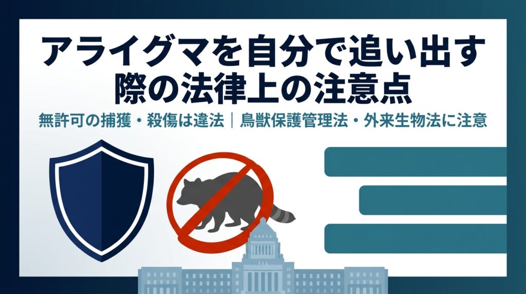 アライグマ対策を自分で行う場合、法律上の制約を理解しておく必要があります。知らずに違法行為をしてしまうと罰則の対象となるため、正しい知識を持って対処しましょう。
