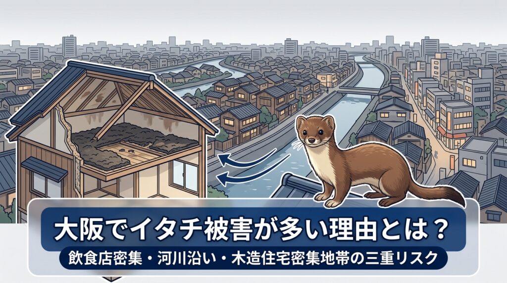 大阪でイタチ被害が多発する最大の理由は、飲食店の密集・河川沿いの立地・木造住宅密集地帯という3つの環境要因が揃っている点にあります。