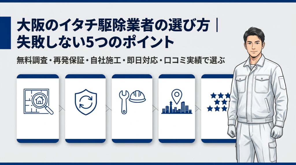 イタチ駆除業者の選び方には明確な判断基準があります。大阪エリアでの業者選びで後悔しないために、以下の5つのポイントを押さえましょう。業者選びの全般的な知識については関連記事も参考にしてください。