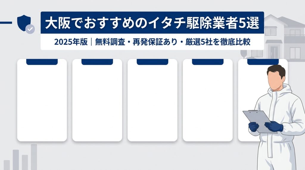大阪府内でイタチ駆除を依頼できるおすすめ業者を5社厳選しました。選定基準は、大阪府対応可・無料調査あり・再発保証制度あり・施工体制の明確さ・公開情報の充実度の5項目です。一般社団法人日本有害鳥獣駆除・防除管理協会の特別会員である害獣BUZZと害獣プロスピードを含め、各社の特徴を統一フォーマットで紹介します。