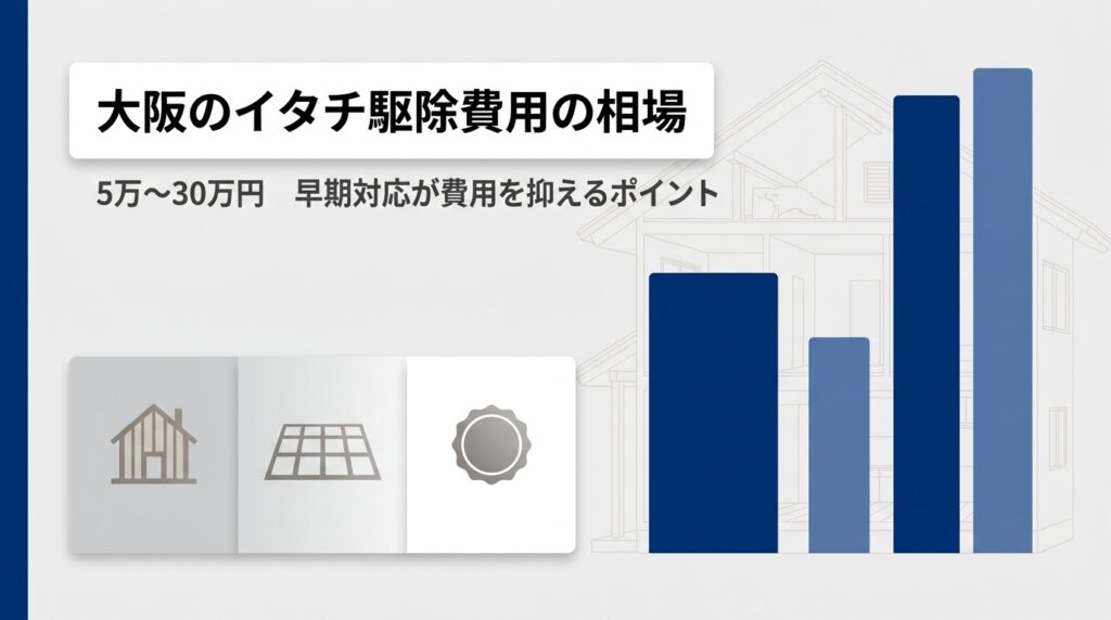 大阪のイタチ駆除費用は、一般的に5万〜30万円程度が相場です。被害の範囲・建物の構造・侵入口の数によって費用は大きく変動します。この金額は、2025年時点の複数社の公開情報および当協会への相談事例に基づく目安です。費用について詳しく知りたい方は関連記事も参考にしてください。