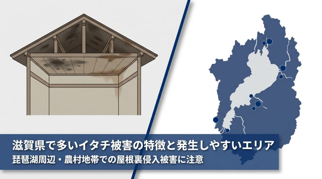 滋賀県内でイタチ被害の相談が多いのは、大津市・草津市・彦根市・近江八幡市など琵琶湖周辺の住宅街や農村部です。水辺や農地に近いため、餌となる小動物や昆虫が豊富にいる環境が整っています。