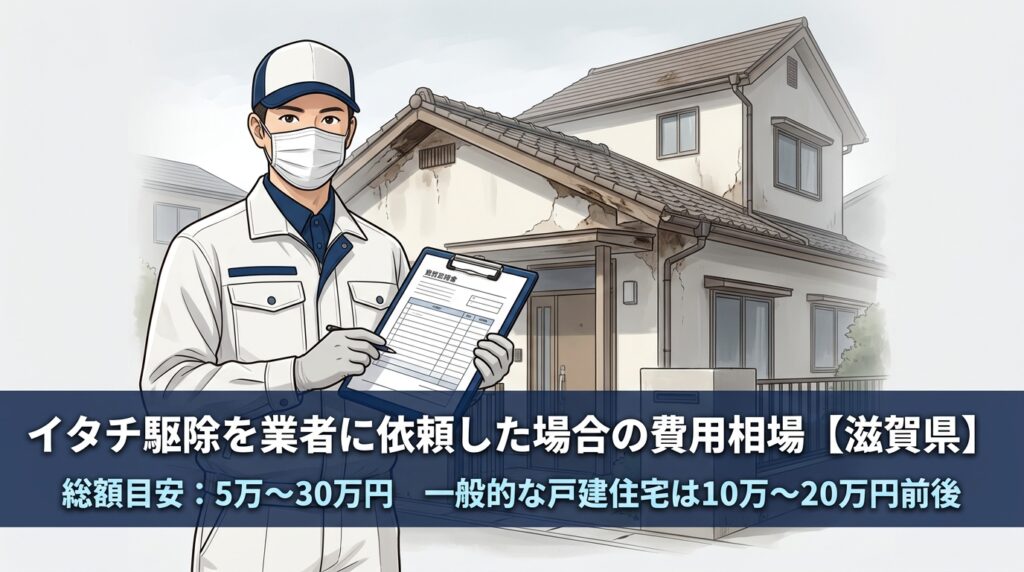 イタチ駆除の総額費用相場は5万〜30万円程度です。金額に幅があるのは、被害の状況や家屋の構造、必要な作業内容によって料金が大きく変動するためです。滋賀県内でも一般的な戸建住宅であれば10万〜20万円前後に収まるケースが多くなっています。費用の詳細は下記の記事で解説しています。