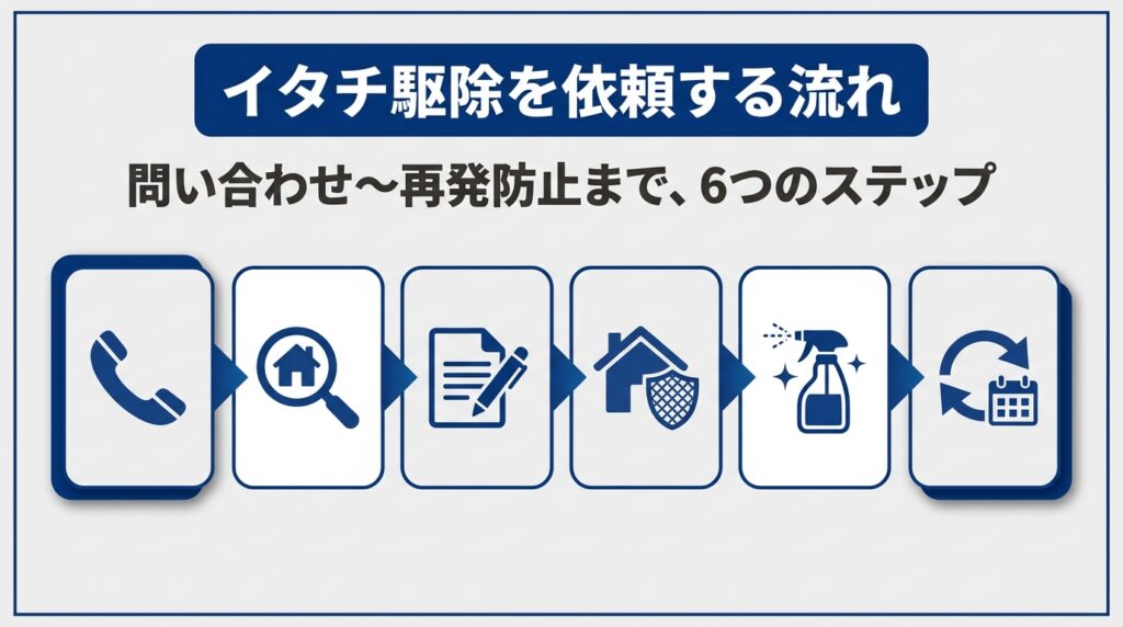 イタチ駆除の依頼は、無料相談→現地調査・見積もり→施工・再発防止の3ステップで進みます。初めて業者に依頼する方でも、各段階で確認すべきポイントを把握しておけば安心して任せられます。