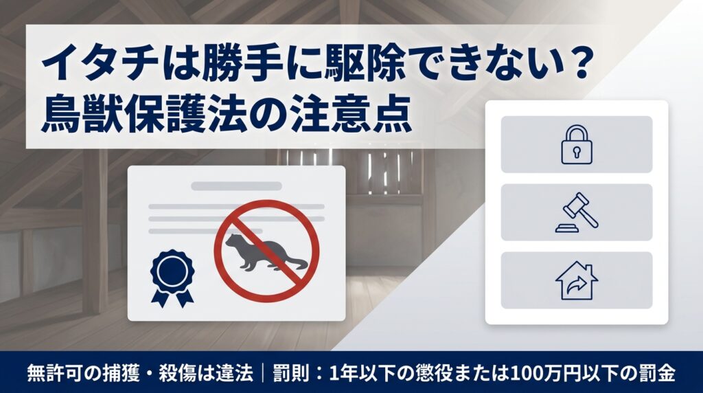 イタチは鳥獣保護管理法で保護されており、無許可での捕獲・殺傷は1年以下の懲役または100万円以下の罰金の対象です。イタチを駆除する場合は、事前に行政からの許可が必要で、お住まいの市区町村役場や都道府県の担当窓口で捕獲許可を申請します。特にメスのイタチは通年捕獲禁止であるため、オス・メスの判別ができない一般の方は自力での駆除を控えてください。