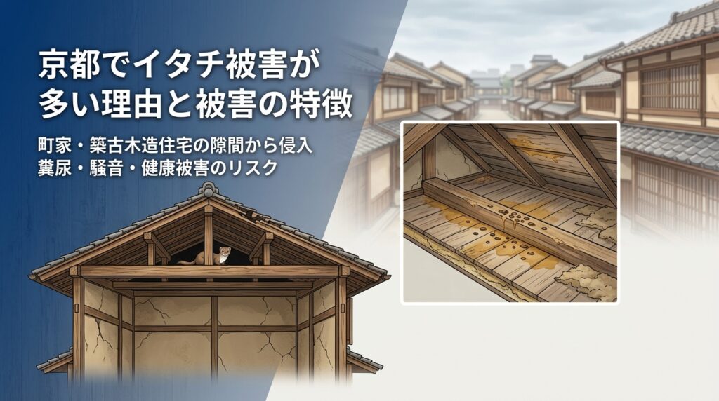 京都は日本有数の歴史都市であり、市内には木造の町家や築数十年の住宅が集中しています。西日本の住宅で害獣被害を引き起こすイタチの大半はシベリアイタチ(旧名チョウセンイタチ)です。住宅構造と都市環境の両面で、イタチが侵入・繁殖しやすい条件がそろっている点が、京都特有の被害リスクを生んでいます。