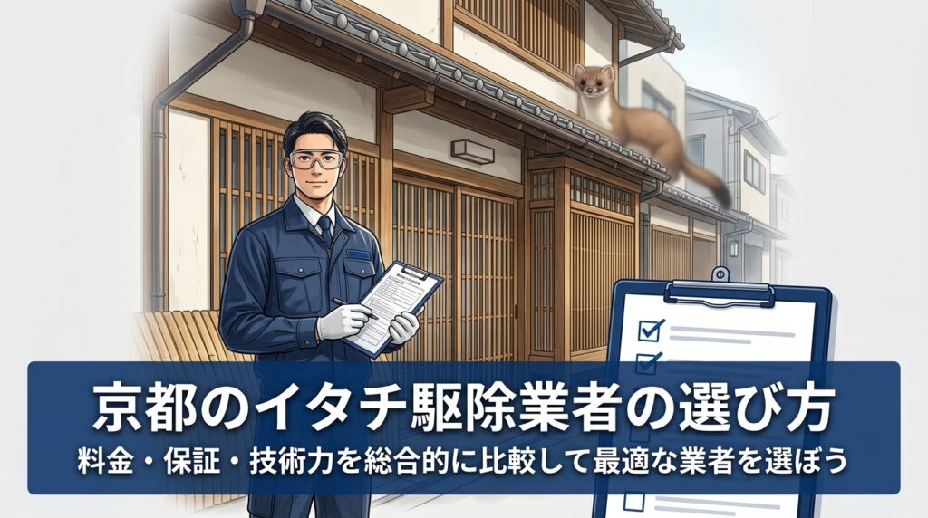 この記事では、京都でのイタチ駆除に精通した編集部が、おすすめ業者2選・費用相場・法律上の注意点・業者が来るまでの応急処置をまとめて解説します。読み終えるころには、状況に合った最適な対処法がわかり、すぐに行動に移せるはずです。
