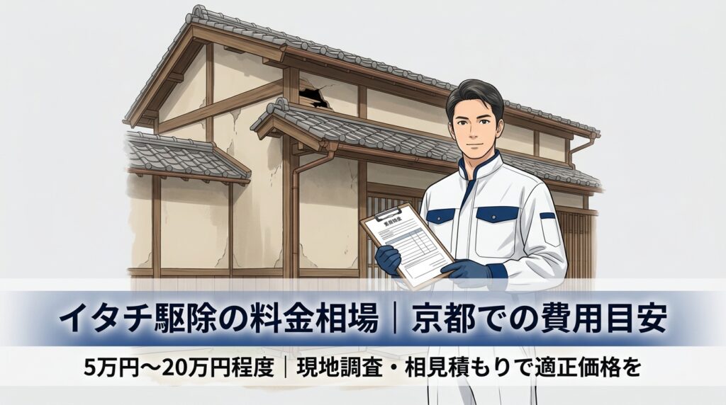 イタチ駆除の費用相場は、一般的な戸建てで5万〜20万円程度が目安です。被害の状況や家屋の構造、必要な作業内容によって料金は大きく変動します。京都の町家のように侵入口が多い住宅では封鎖箇所が増える分、相場の上限に近づく傾向があります。