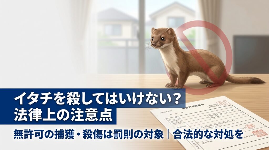 イタチは鳥獣保護管理法で保護されており、許可なく捕獲・殺傷すると1年以下の懲役または100万円以下の罰金が科せられます。一方、忌避剤を使った追い出しや侵入口封鎖は許可不要であり、すぐに着手できる合法的な対処法です。