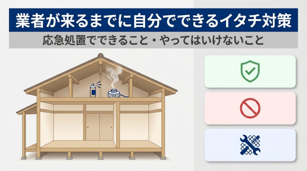 業者に連絡してから現地調査までに1〜数日かかるケースもあります。その間にできる応急処置として、忌避剤による一時的な追い出し・やってはいけないNG行動の把握・予防のための環境整備の3点を押さえてください。